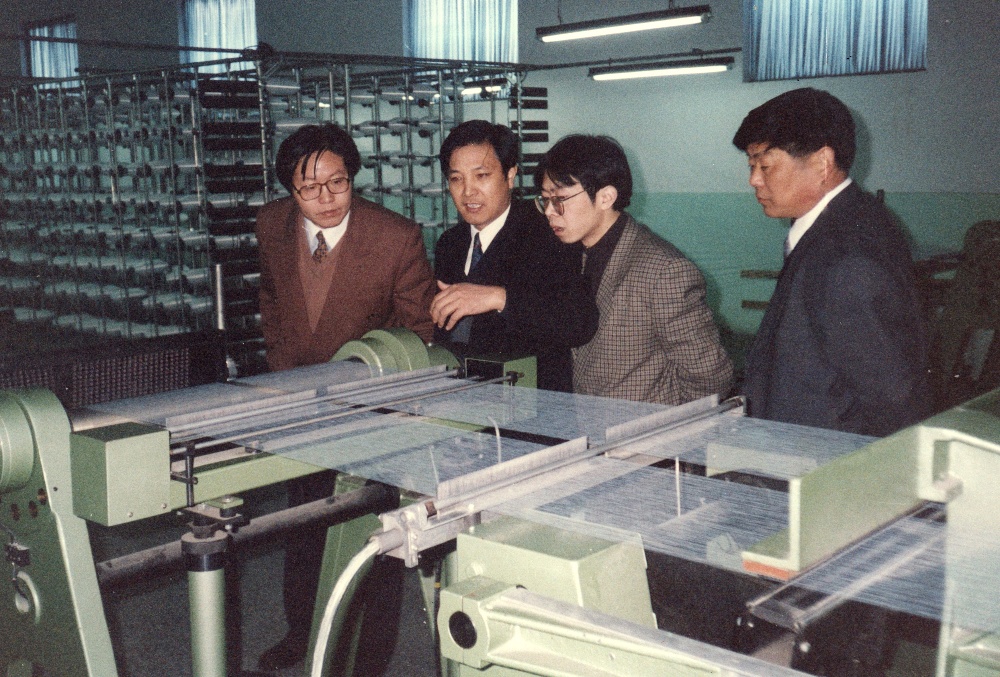 At that time, Haining Mayor Ying Zhongliang (left) was in the workshop of Zhejiang Hongda Warp Knitting Industrial Company.