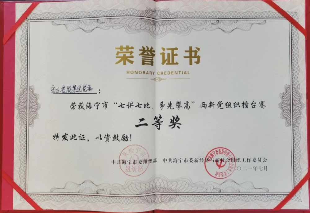 為深入學(xué)習(xí)貫徹習(xí)近平新時(shí)代中國(guó)特色社會(huì)主義思想,大力弘揚(yáng)“紅船精神”,進(jìn)一步深化黨建高地創(chuàng)建,2021年7月29日下午,在有近300人參加的兩新組織書記(黨務(wù)工作者)培訓(xùn)班上,海寧市委組織部舉辦了“七講七比、爭(zhēng)先攀高”兩新黨組織擂臺(tái)賽。行政支部許銓代表宏達(dá)集團(tuán)黨委參賽,榮獲二等獎(jiǎng)。
