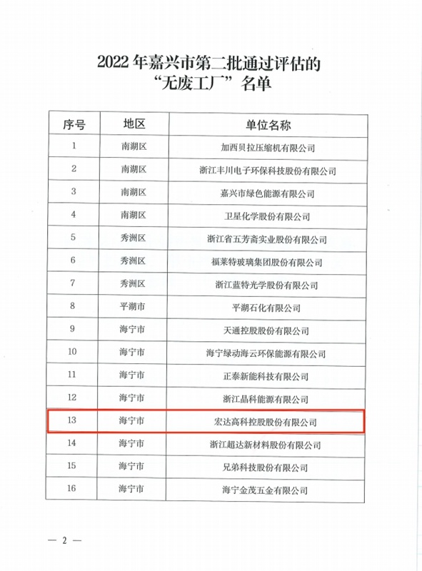近日,根據(jù)嘉興市生態(tài)環(huán)境局和嘉興市經(jīng)濟和信息化局文件,宏達高科被評為2022年嘉興市第二批“無廢工廠”。