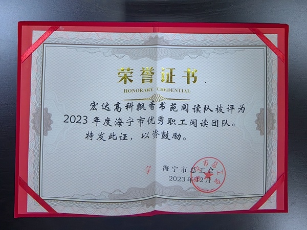 4月8日,“工會向潮?悅讀相伴”海寧市職工有聲書屋建設(shè)現(xiàn)場會暨海寧市第七屆職工文化藝術(shù)節(jié)開幕式在鹽官鎮(zhèn)舉行,宏達高科控股股份有限公司在會上被評為海寧市“書香企業(yè)”,“宏達高科”飄香書苑職工閱讀團隊被評為2023年度海寧市優(yōu)秀職工閱讀團隊。